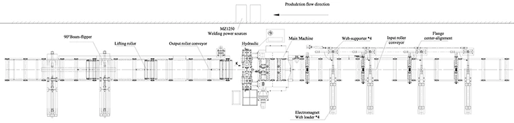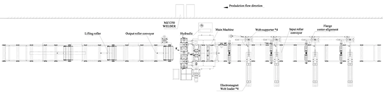 Barisan kimpalan rasuk ZHJ3-in 1 h standard terdiri daripada satu jadual roller input, kimpalan utama dan stesen pelurus, table outputroller. Pada stesen kimpalan utama dan meluruskan di sana dipasang dengan unit pemulihan fluks, kepala kimpalan dengan obor dan alat pengapit untuk bebibir dan web.